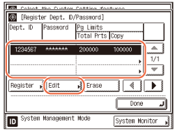 Press [] or [] to display the Department ID whose password you want to change → select the Department ID → press [Edit].