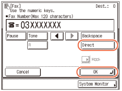 Vajuta valitavasse faksinumbrisse mitmesekundilise pausi sisestamiseks. Kui sisestate pausi koos faksi numbriga, kuvatakse täht <p> teiste numbrite vahele. Kui sisestate pausi faksi numbri lõpus, ilmub täht <P>. Kaugvalimisnumbri valimisel sisesta paus pärast rahvusvahelist kaugvalimiskoodi ja samuti faksinumbri lõppu. (Kaugvalimisnumbri valimine)