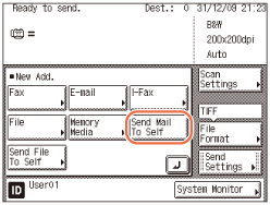 Volitatud saatmise funktsioon annab lihtsa viisi omaenda e-posti aadressi määramiseks sihtkohaks. Seade hangib sisseloginud kasutaja e-posti aadressi automaatselt autentimise serverist, kui kasutaja logib sisse volitatud saatmisse. Kui vajutad [Saada kiri endale], siis saad määrata sihtkohaks oma e-posti aadressi.