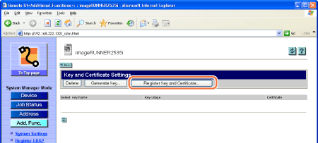 The Remote UI starts registering the key and certificate and when it is complete, the page returns to the Register Key and Certificate page.