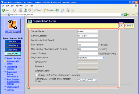 Specifying the LDAP server settings is available only when the Remote UI is in the System Manager Mode.