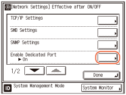Changes made to SNMP Settings and Enable Dedicated Port become effective when the machine is restarted. To restart the machine, turn it OFF, wait at least 10 seconds, and then turn it ON. For instructions on how to turn the machine ON and OFF, see Chapter 2, “Before You Start Using the Machine,” in the User’s Guide.