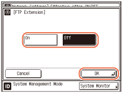 Changes made to FTP Extension become effective when the machine is restarted. To restart the machine, turn it OFF, wait at least 10 seconds, and then turn it ON. For instructions on how to turn the machine ON and OFF, see Chapter 2, “Before You Start Using the Machine,” in the User’s Guide.