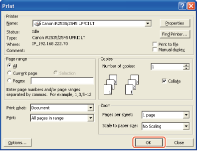 Määritä tulosteiden määrä ja tarvittaessa myös tulostettavat sivut → napsauta [OK].*