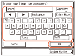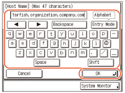 Syötä isäntänimi (enintään 47 merkkiä tai 120 merkkiä kun [Windows (SMB)] on valittu palvelinprotokollaksi) käyttämällä kosketusnäytön painikkeita → paina [OK].