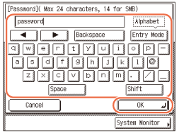 Syötä salasana (enintään 24 merkkiä tai 14 merkkiä kun [Windows (SMB)] on valittu palvelinprotokollaksi) käyttämällä kosketusnäytön painikkeita → paina [OK].