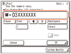 Paina muutaman sekunnin tauon syöttämiseksi valitsemaasi faksinumeroon. Kun syötät tauon, ko. kohtaan numeron sisällä tulee kirjain <p>. Jos lisäät tauon faksinumeron loppuun, ilmestyy kirjain <P> . Kun valitset ulkomaannumeron, lisää tauko maatunnuksen jälkeen ja faksinumeron loppuun. (Ulkomaannumeron valinta)