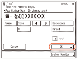 Jos Vahvista syötetyt faksinumerot kohdassa Estä lähetystoiminto on asennossa 'Kyllä', sinun on vahvistettava faksinumero syöttämällä se uudelleen. Syötä faksinumero jonka syötit vaiheessa 5 → paina [OK]. (
