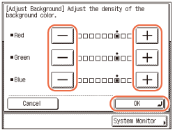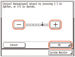 Jos Lähetystoimintoa (lisävaruste malleissa imageRUNNER 2525/2520) ei ole aktivoitu ja lisävaruste Super G3 Fax Board-AG1 on asennettu laitteeseen, avautuu tässä vaiheessa alla kuvattu ikkuna. Säädä taustan värin tummuutta painamalla [-] tai [+] → paina [OK].