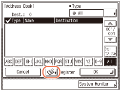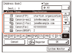 [Ryhmä]: Näyttää kaikki ryhmäosoitteena tallennetut vastaanottajat. [Faksi]: Näyttää kaikki tallennetut faksivastaanottajat. [Sähköposti]: Näyttää kaikki tallennetut sähköpostivastaanottajat. [I-faksi]: Näyttää kaikki tallennetut I-faksivastaanottajat. [Tiedosto]: Näyttää kaikki tallennetut tiedostopalvelinvastaanottajat. [Pikavalinta]: Näyttää kaikki pikavalintapainikkeisiin tallennetut vastaanottajat. |