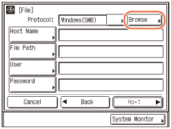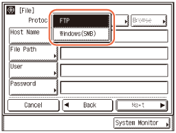 Syötä salasana (enintään 24 merkkiä tai 14 merkkiä kun [Windows (SMB)] on valittu palvelinprotokollaksi) käyttämällä kosketusnäytön painikkeita → paina [OK]. Kun olet painanut [OK], syöttämäsi salasana näkyy tähtinä (********) [Tiedosto]-ikkunassa.