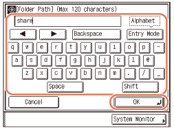 Syötä isäntänimi (enintään 47 merkkiä tai 120 merkkiä kun [Windows (SMB)] on valittu palvelinprotokollaksi) käyttämällä kosketusnäytön painikkeita → paina [OK].