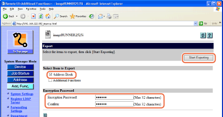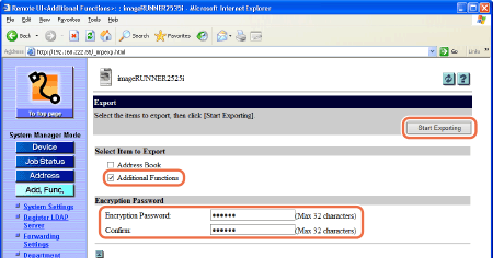 The Import/Export function is available only when the Remote UI is in the System Manager Mode.