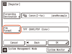 [TIFF (B&W)/PDF (Color)]: Forwards the file in the TIFF (B&W) or PDF (Color) format.