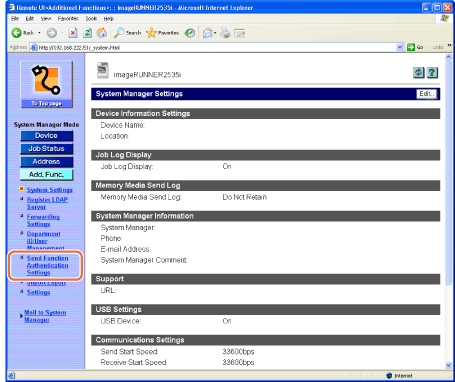 Specifying the Authorized Send settings is available only when the Remote UI is in the System Manager Mode.