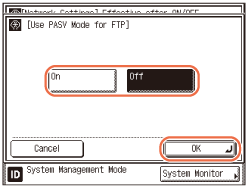 Changes made to Use PASV Mode for FTP become effective when the machine is restarted. To restart the machine, turn it OFF, wait at least 10 seconds, and then turn it ON. For instructions on how to turn the machine ON and OFF, see Chapter 2, “Before You Start Using the Machine,” in the User’s Guide.