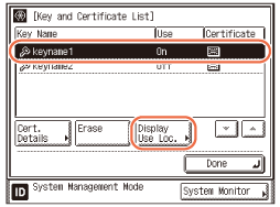 Select the key and certificate with ‘On’ indicated under <Use> → press [Display Use Loc.].