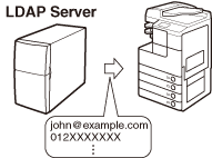 If the information for an LDAP (Lightweight Directory Access Protocol) server is registered in the machine, you can search for e-mail addresses and fax numbers via the LDAP server. E-mail addresses and fax numbers obtained via the server can be specified as destinations or stored in the Address Book.