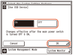 Changes made to Use USB Device become effective when the machine is restarted. To restart the machine, turn it OFF, wait at least 10 seconds, and then turn it ON. For instructions on how to turn the machine ON and OFF, see Chapter 2, “Before You Start Using the Machine,” in the User’s Guide.