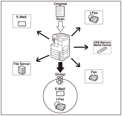Lai nosūtītu dokumentus uz e-pastu un i-faksu vai uz failu serveri, vai USB atmiņas ierīci modelī imageRUNNER 2525/2520 jābūt aktivizētai sūtīšanas funkcijai ar papildaprīkojuma krāsu sūtīšanas komplektu Y1.