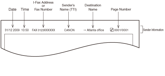 Ja iekārta ir iestatīta tā, lai saņemtajās lappusēs tiktu izdrukāti nosūtītāja dati, un ja daļa datu nav reģistrēta, tiek izdrukāti tikai nepieciešamie reģistrētie dati un oriģināla lappušu kopējais skaits. Taču, ja tiek izmantots tiešās sūtīšanas režīms, kopējais oriģināla lappušu skaits netiek drukāts.