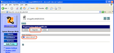 The Remote UI starts registering the key and certificate and when it is complete, the page returns to the Register Key and Certificate page.