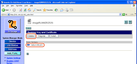 The Remote UI starts installing the key and certificate and when it is complete, the page returns to the Register Key and Certificate page.