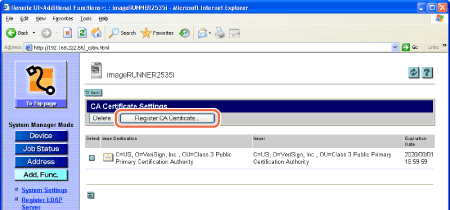 The Remote UI starts registering the CA certificate and when it is complete, the page returns to the CA Certificate Settings page.