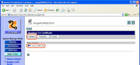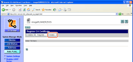 The Remote UI starts installing the CA certificate and when it is complete, the page returns to the Register CA Certificate page.
