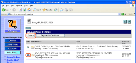 Click [] (Select) next to the CA certificate you want to delete → [Delete].