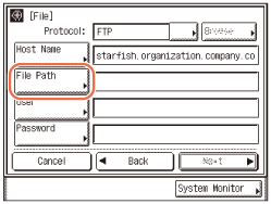 Naudodamiesi ekrano klaviatūra įveskite slaptažodį (iki 24 ženklų arba 14 ženklų, kai pasirinktas serverio protokolas [Windows (SMB)]) → paspauskite [Gerai]. Paspaudus [Gerai], įvestas slaptažodis ekrane [Failas] bus rodomas žvaigždutėmis (********).