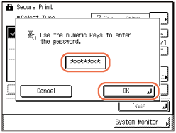 Nurodykite norimus saugaus spausdinimo užduoties parametrus ir spustelėkite [OK] (Gerai).