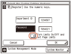 ] (Page Limit) next to [On]/[Off] of the desired function(s) → enter the page limit restriction using
