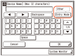 Poniższa procedura, korzysta z ekranu Nazwa urządzenia, jako przykładu, by pokazać jak wprowadzić znaki. (Other System Settings)