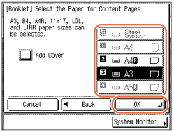 Wybierz źródło papieru, z którego podawany będzie papier na stronę okładki → wciśnij kolejno przycisk [OK] → [Wykonaj].