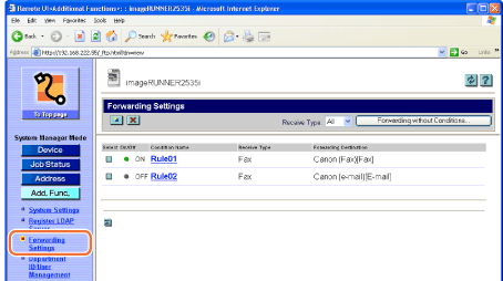 Specifying the Forwarding Settings is available only when the Remote UI is in the System Manager Mode.