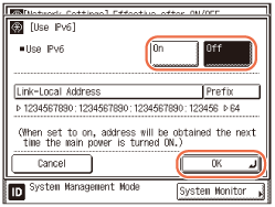 Press [Manual Address] → enter the IPv6 address value → press [OK].