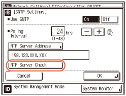Press [NTP Server Address] → enter the NTP server’s address → press [OK].