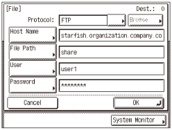Up to 47 alphanumeric characters can be entered for [Host Name] and 120 characters for [File Path] on the touch panel display.