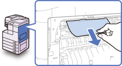 Przy usuwaniu papieru zablokowanego wewnątrz urządzenia należy uważać, aby nie rozciąć dłoni lub nie zranić się o wewnętrzne elementy. Jeśli nie można usunąć zablokowanego papieru, należy skontaktować się autoryzowanym sprzedawcą firmy Canon.