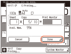 Carregue em [Cancelar] no ecrã de contexto que aparece quando a máquina está a ler, a imprimir ou à espera de imprimir.Também pode cancelar o trabalho de cópia atual, carregando em
