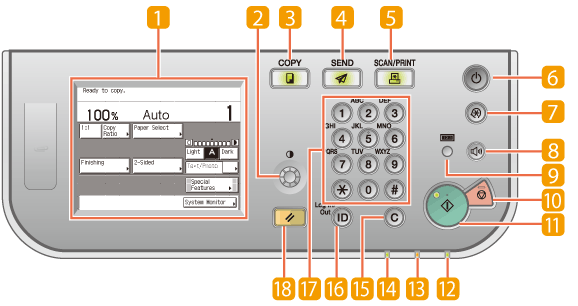 O painel de controlo consiste no visor do painel digital, teclas físicas para várias operações, teclas numéricas e indicadores.
