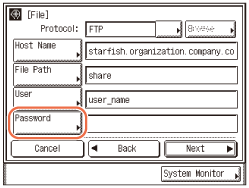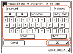 Introduza uma password (até 24 carateres ou 14 carateres se [Windows (SMB)] for selecionado como protocolo de servidor) com o teclado no ecrã → carregue em [OK].Depois de carregar em [OK], os carateres que introduzir para a password aparecem sob a forma de asteriscos (********) no ecrã [Ficheiro].