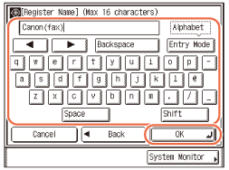 Introduza o nome do anfitrião (até 47 carateres ou 120 carateres se [Windows (SMB)] for selecionado como protocolo de servidor) com o teclado no ecrã → carregue em [OK].