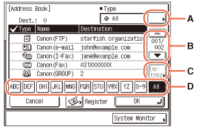 Carregue nestas teclas (ex.: [ABC]) para ver as teclas individuais de cada letra ou número.Para limitar o intervalo das entradas apresentadas, pode selecionar uma letra ou um número.Carregue em [Tudo] para voltar à lista de endereços completa.