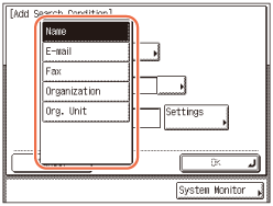 Se a função Enviar (opcional para a imageRUNNER 2525/2520) estiver ativada e a Placa de fax Super G3 AG1 opcional estiver instalada na máquina, pode ordenar e limitar a visualização dos endereços apresentados através da lista pendente Tipo.