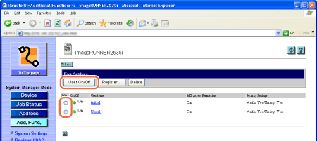 Select the button for the user you want to enable/disable under <Select> in the user list → click [User On/Off].