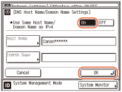 Press [On] for <Use Same Host Name/Domain Name as IPv4> → press [OK].