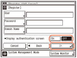 If Authorized Send is activated, <Carry Over Send Auth. Info.> appears on the top of the Register screen. Press [On] to use the same user name and password as the login information for Authorized Send or [Off] to use the user name and password registered at this step.
