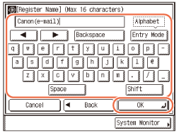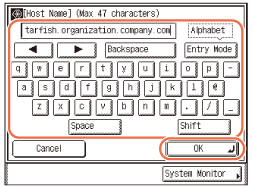 Introduceţi numele de gazdă (până la 47 caractere sau 120 caractere dacă s-a selectat [Windows (SMB)] ca protocol de server) utilizând tastatura de pe ecran → apăsaţi [OK].